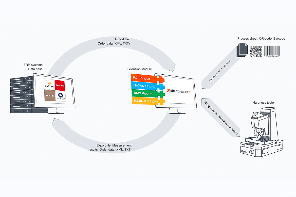 Qpix软件平台支持条形码和二维码阅读器。无论是简单插入头文件(序列),管理用于模板自动选择的读取装置的完全整合,或从上级系统(选配)中调用数据-条形码/二维码阅读器都简化了硬度计的工作程序,同时也防止了操作错误。
