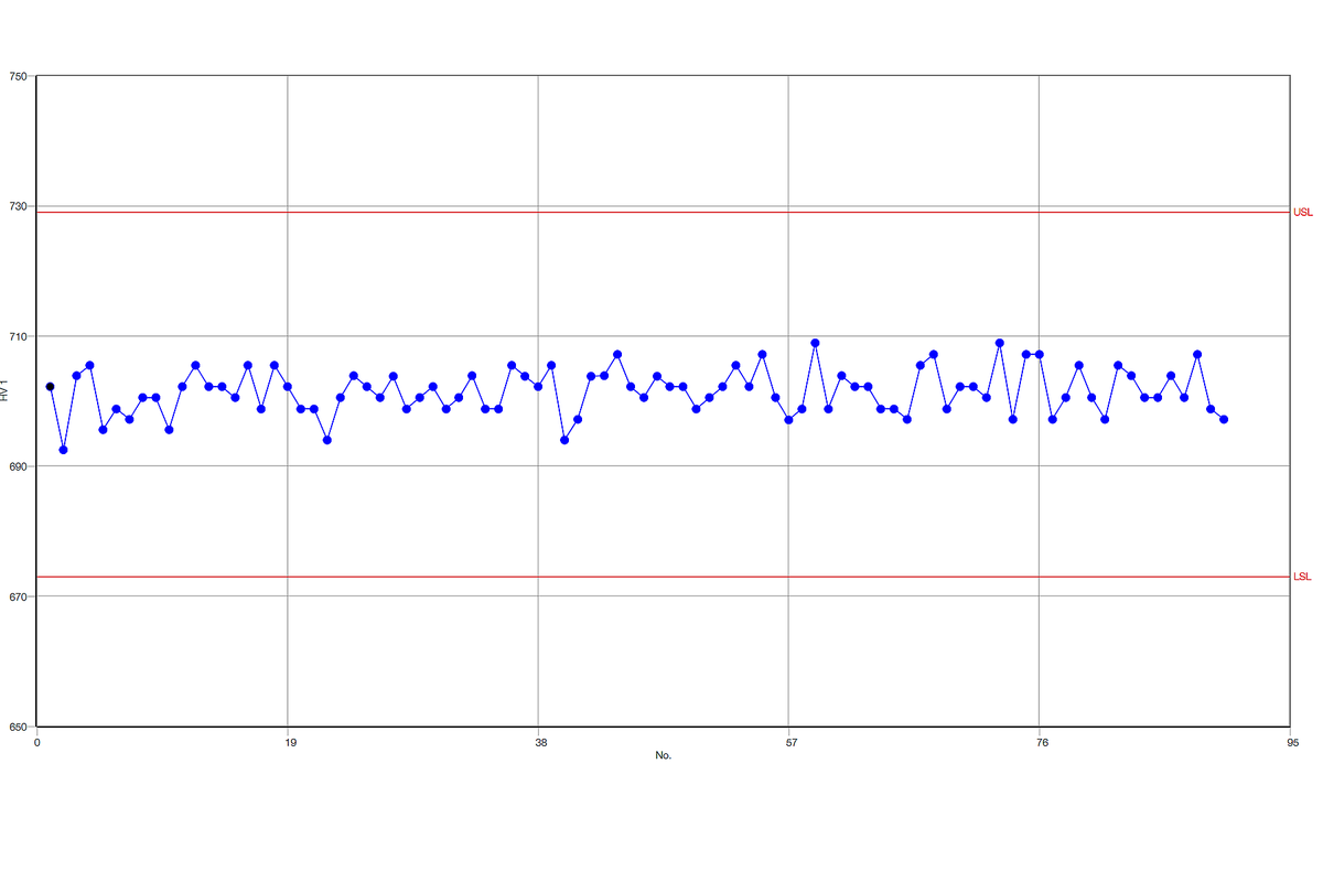 在701/HV1硬度块上打90个测试点。针对相同的90个压痕,采用不同的评估模式进行测量。